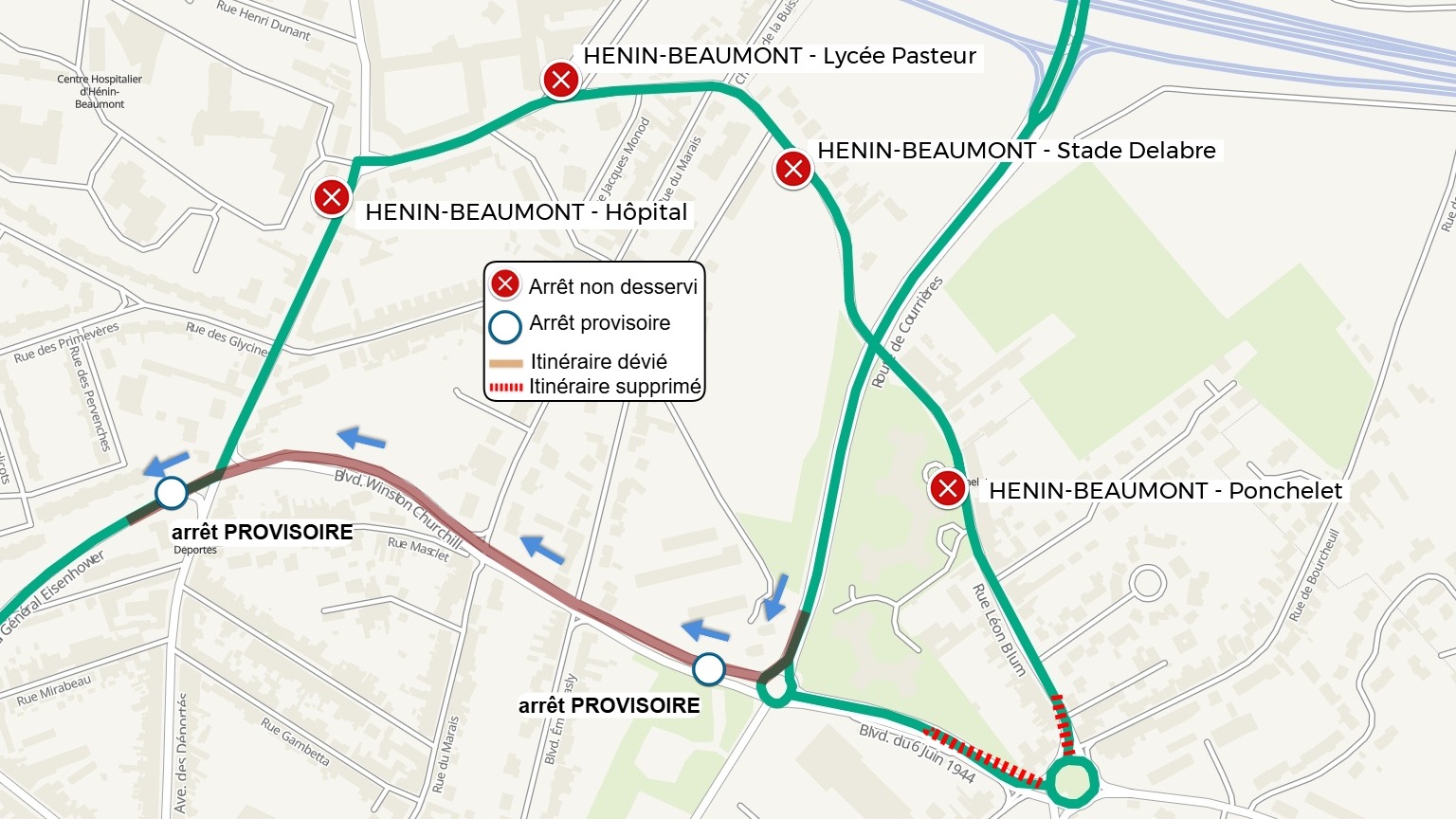 15 L'arrêt HENIN-BEAUMONT - Ponchelet est déplacé à l'arrêt PROVISOIRE rue Winston Churchill