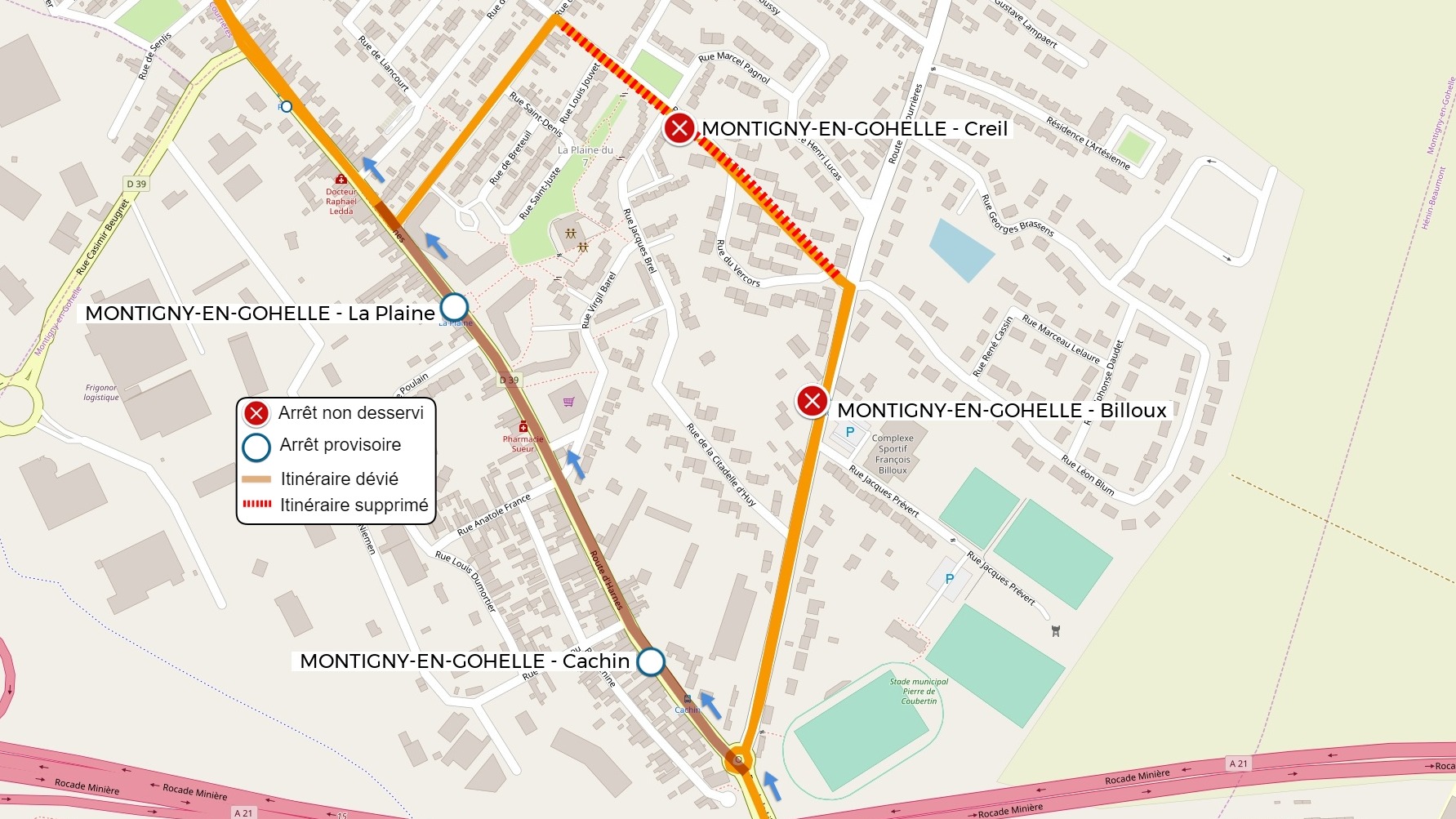 | L'arrêt MONTIGNY-EN-GOHELLE - Creil est reporté à l'arrêt MONTIGNY-EN-GOHELLE - La Plaine |