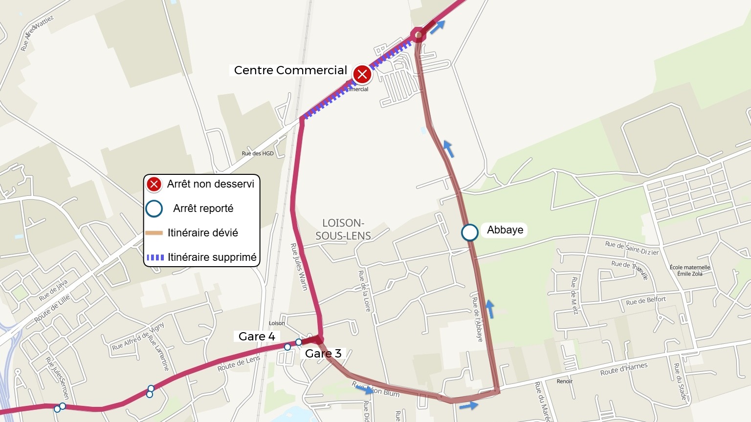 L'arrêt LENS - Bourdonnais est reporté à l'arrêt LENS - Hôpital |