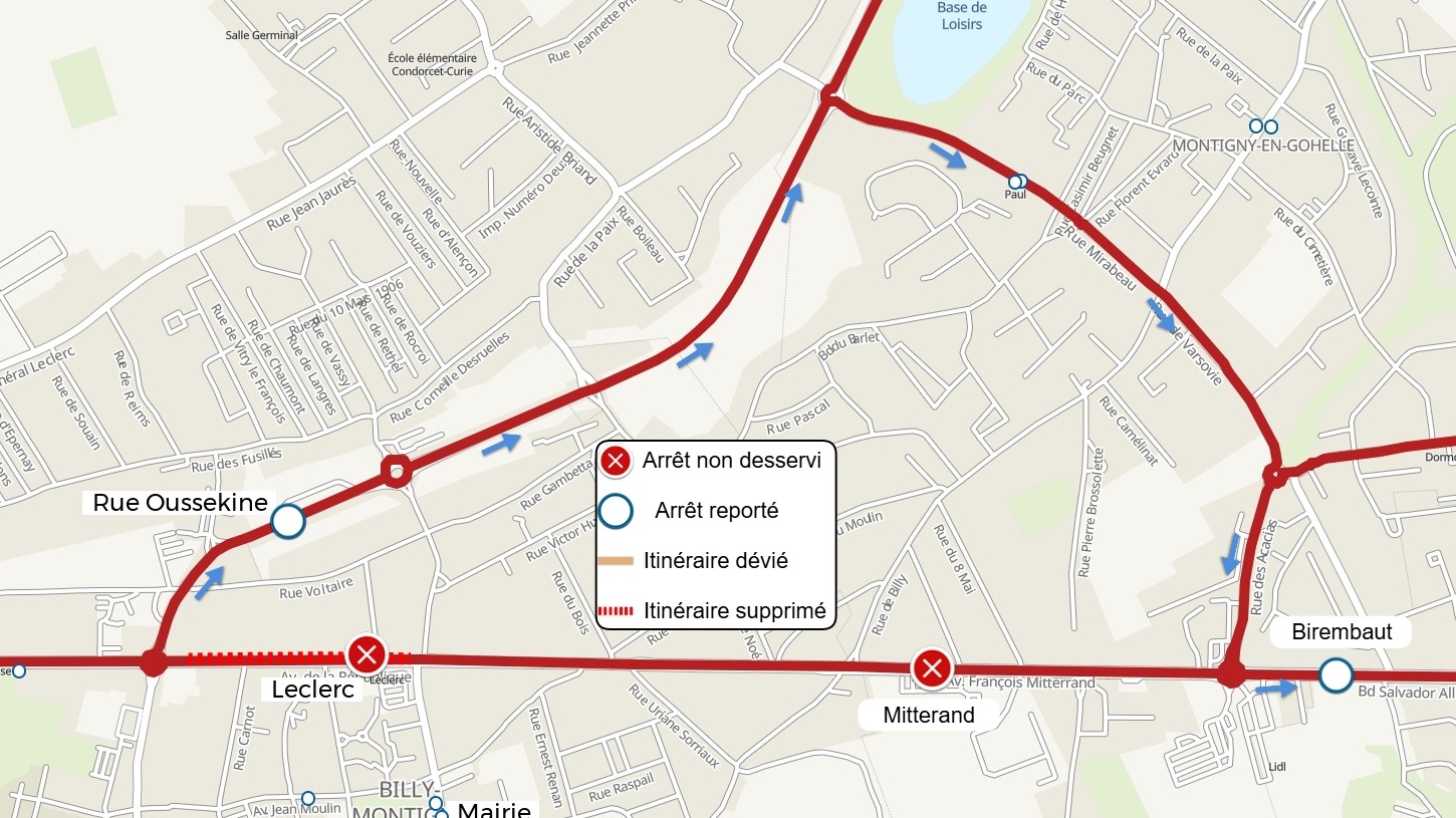 L'arrêt Leclerc est déplacé àl'arrêt Oussekine en ligne B1 et à l'arrêt Mairie pour les lignes 25 et 27 |