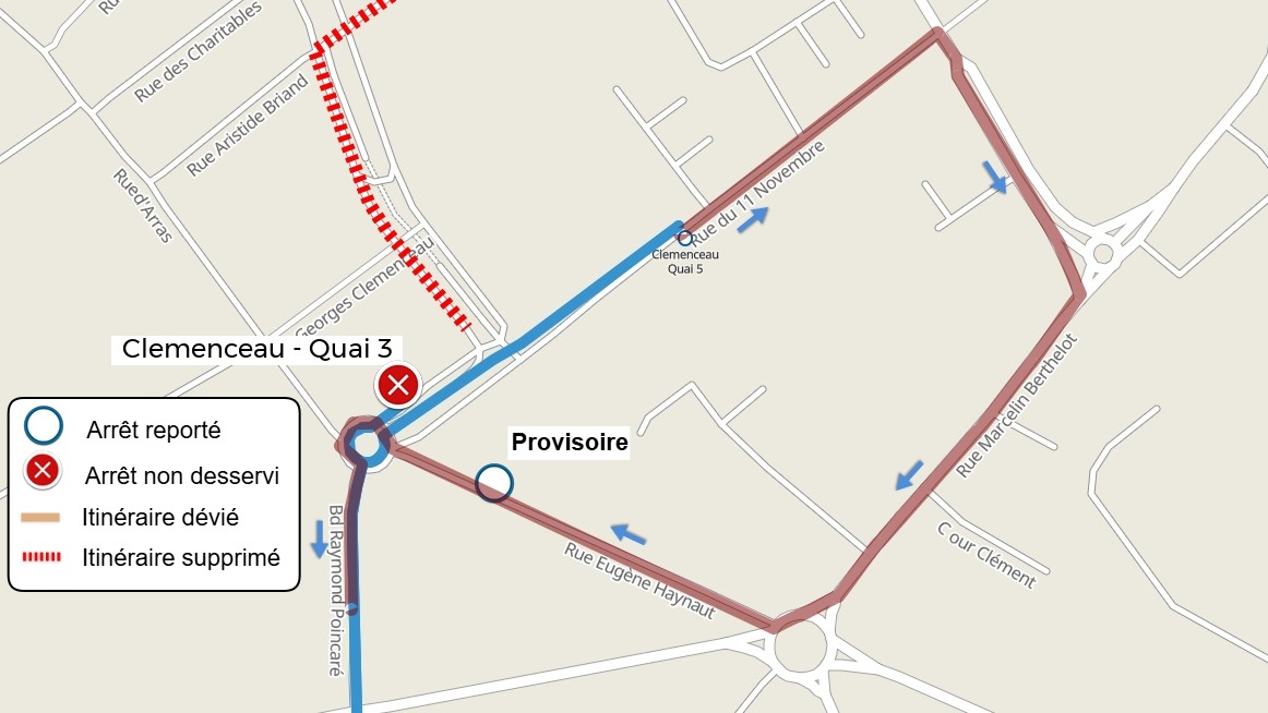| L'arrêt Clemenceau - Quai 1 est déplacé à l'arrêt PROVISOIRE (Rue Eugène Haynaut) | |
